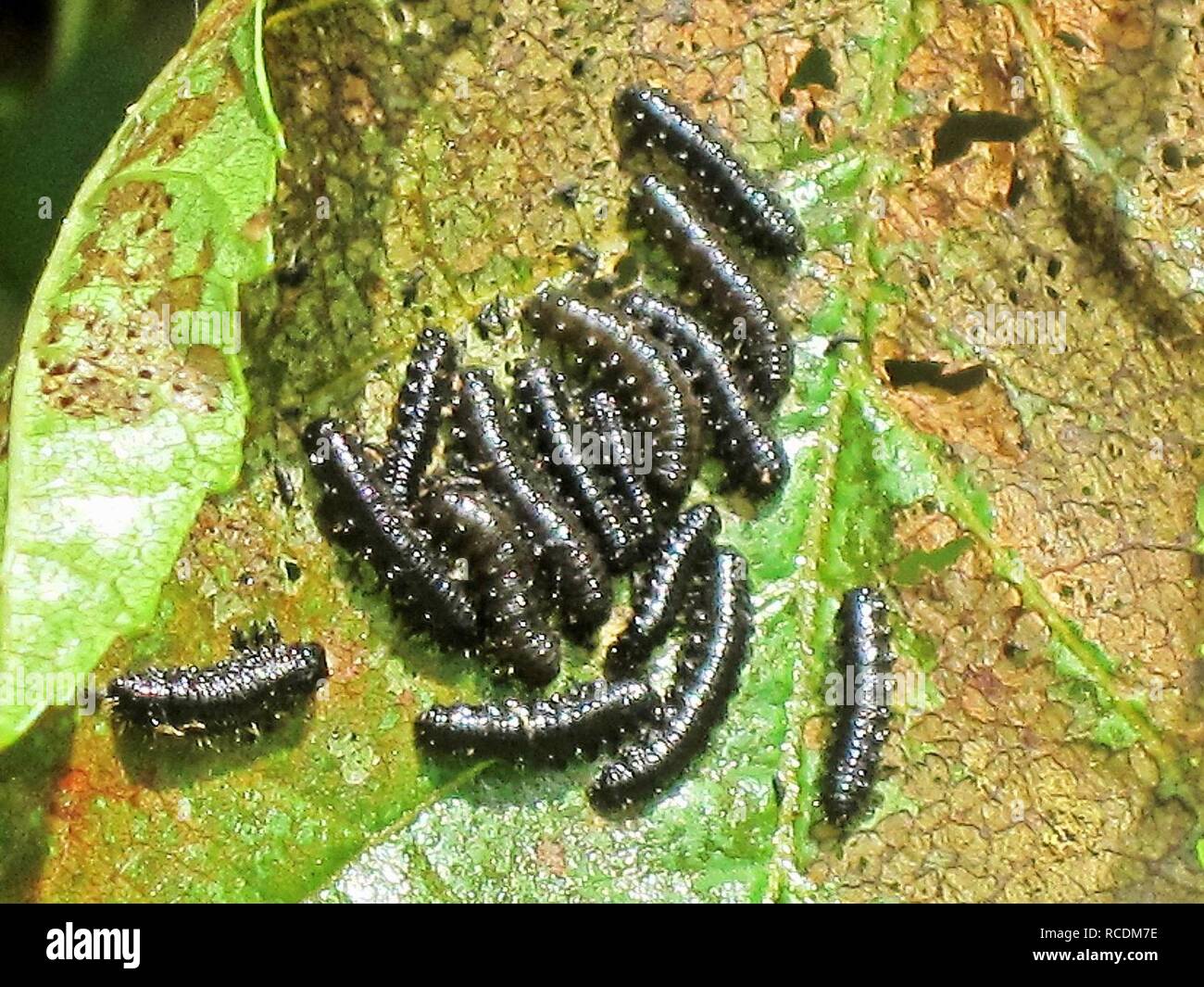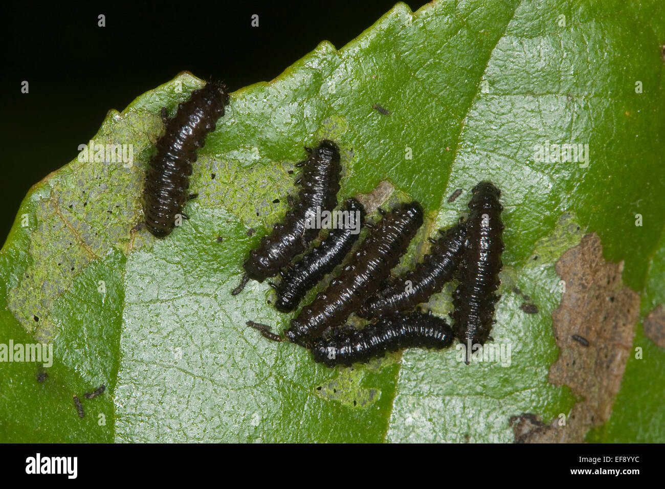 Alder leaf beetle larvae Agelastica alni that have recently emerged from their eggs. Larvae usually feed on leaves of alders but can develop on Downy Birch Hazel and Goat Willow. Agelastica alni larve