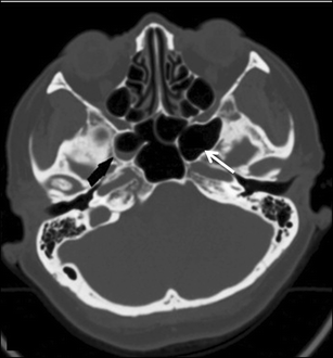 Soft tissue sphenoid sinus. Fluid right middle ear cavity and right mastoid air cells suggesting an active inflammatory process. Coronal reformatted image in a soft-tissue window from a noncontrast CT scan shows a soft-tissue mass centered on the sphenoid sinus with dehiscence of the planum sphenoidale arrow. According to his expertise he said the bones that surround the dark area hole of the sphenoid sinus - the one on the left side brokedisinergrated whatever and the soft tissue spilled into that area. Soft tissue sphenoid sinus
