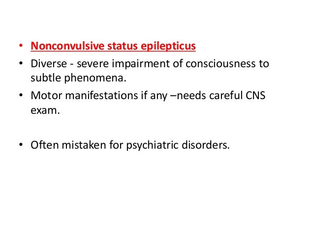 24-hour period move straight to 2nd lineestablished status treatment. This is because longer epileptic seizures status epilepticus can damage the brain. An EEG is needed to confirm the diagnosis but obtaining an EEG on every patient with altered mental state is not practical. Non convulsive status epilepticus nhs